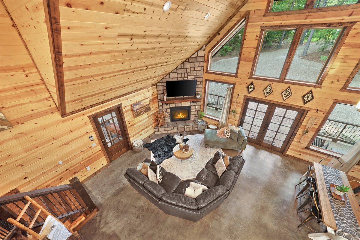 Step into Lazy Horse Lodge’s living room via keyless entry and sink into buttery leather seating in the spacious living room. Relax and exult in the rustic charm and airy feel afforded by the soaring ceiling as you warm yourself by the gas fireplace.